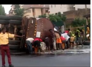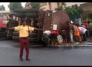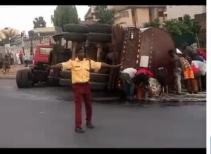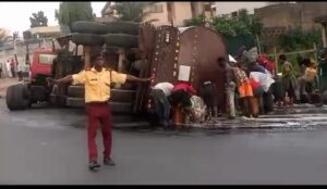 Priliminary investigation revealed that the tanker fully loaded with diesel was coming from old Toll-Gate going to Mowe Ibafo overturned near Capital Oil inwards Berger on Lagos Ibadan express way.The cause of the auto crash yet to be ascertained.