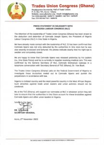 The Trade Union Congress (TUC) of Ghana has issued a strong statement condemning the recent arrest and alleged brutality of Comrade Joe Ajaero, President of the Nigeria Labour Congress (NLC), by the Imo State Police Command. The statement, signed by Dr. Yaw Baah, the Secretary General of Ghana TUC, was released on November 2, 2023.