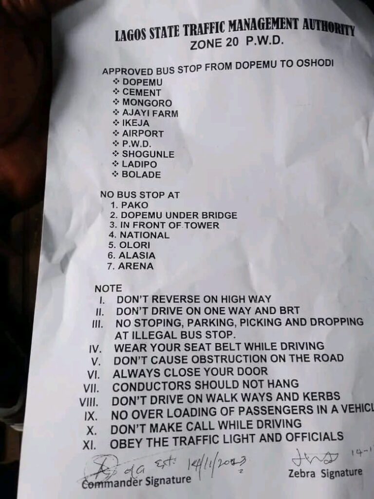 In a recent move to enhance traffic management within Zone 20 P.W.D, the Lagos State Traffic Management Authority (LASTMA) has rolled out comprehensive traffic guidelines and a list of approved bus stops for commuters. The initiative aims to streamline transportation and improve overall road safety.