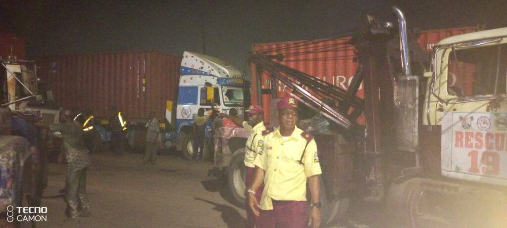 Lagos State Traffic Management Authority (LASTMA) today during an early Sunday morning enforcement operations led by the General Manager, Mr. Bakare Oki Olalekan in conjunction with relevant security Agencies to ensure smooth/seamless traffic for Lagosians during this festive seasons and beyond, impounded another 78 illegally parked containerised trucks on top High Bridge by Lilly Pond inward Apapa and Sifax axis of Ijora (Olopa).