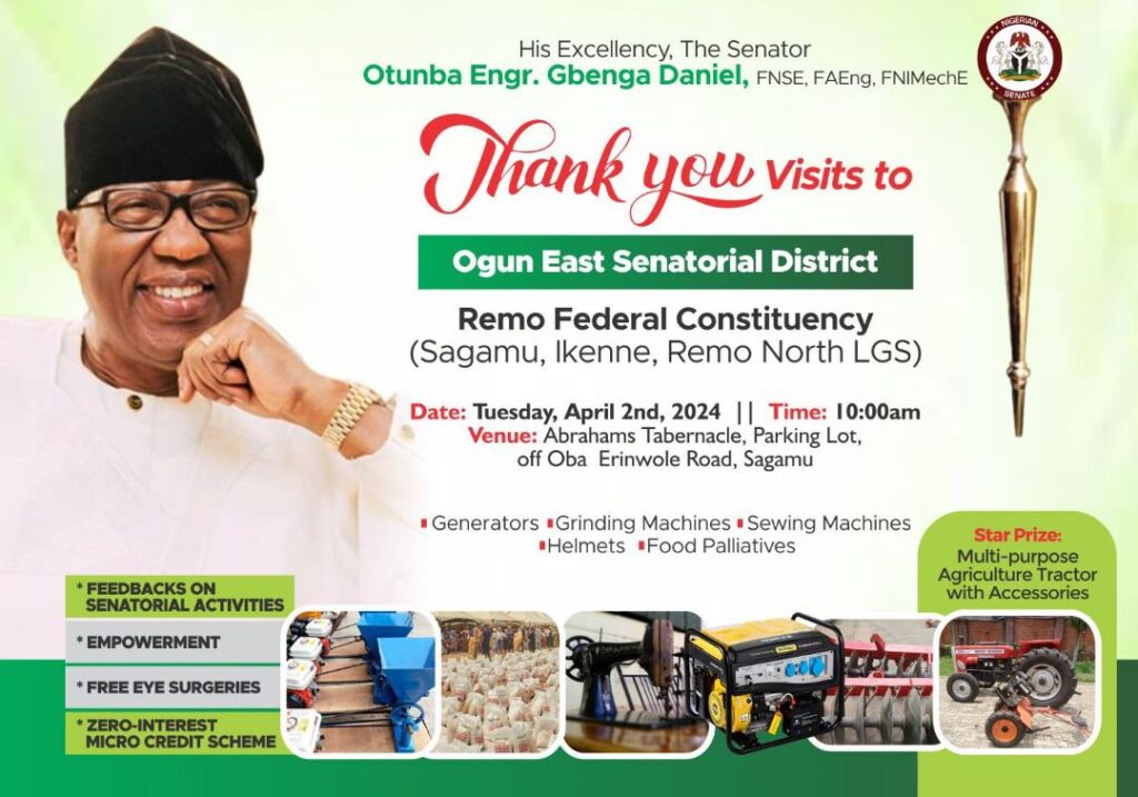 Sagamu, Ogun State – Prepare to join Otunba Gbenga Daniel on April 2nd, 2024, as he extends his gratitude and support to the constituents of Ogun East Senatorial Districts, specifically Remo Federal Constituency encompassing Shagamu, Ikenne, and Remo North. The event is set to take place at the Abraham’s Tabernacle Parking Lot, located off Oba Erinwole Road in Sagamu.