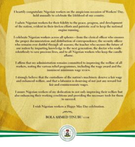 I celebrate Nigerian workers across all spheres—from the clerical officer who ensures the proper documentation and distribution of correspondence; the security officer who remains ever dutiful through all seasons; the teacher who secures the future of our nation by imparting knowledge to the next generation; the doctor who works relentlessly to save precious lives, and to all Nigerian workers who keep the candle aflame.