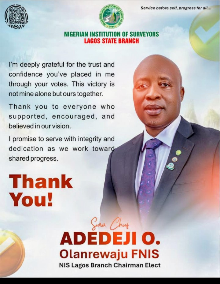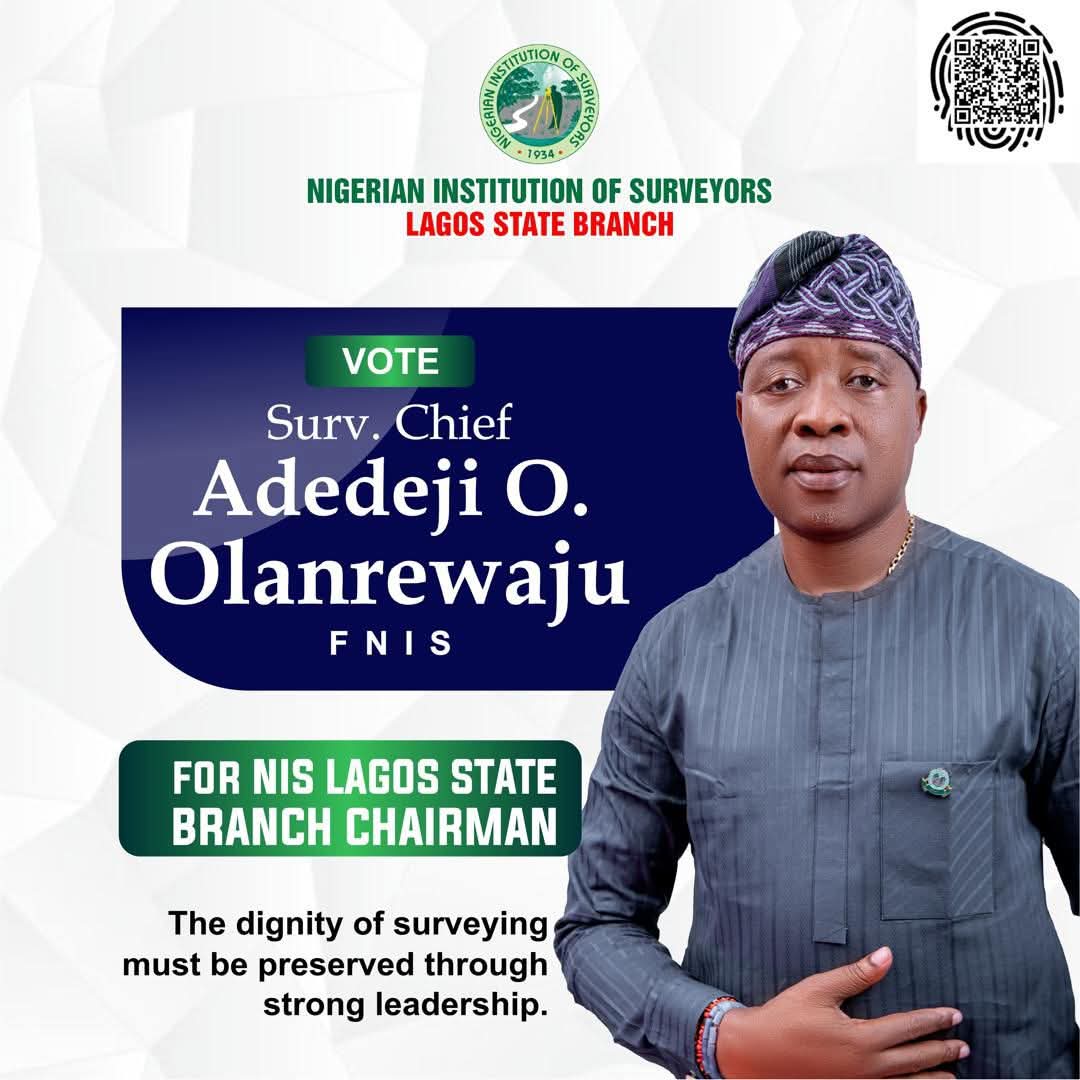 The Nigeria Institution of Surveyors (NIS), Lagos State Branch, has announced the election of Surv. Chief Adedeji O. Olanrewaju, FNIS, as its new Chairman. The election marks a significant milestone for the professional body as it continues to uphold the highest standards of excellence and integrity within the surveying profession.