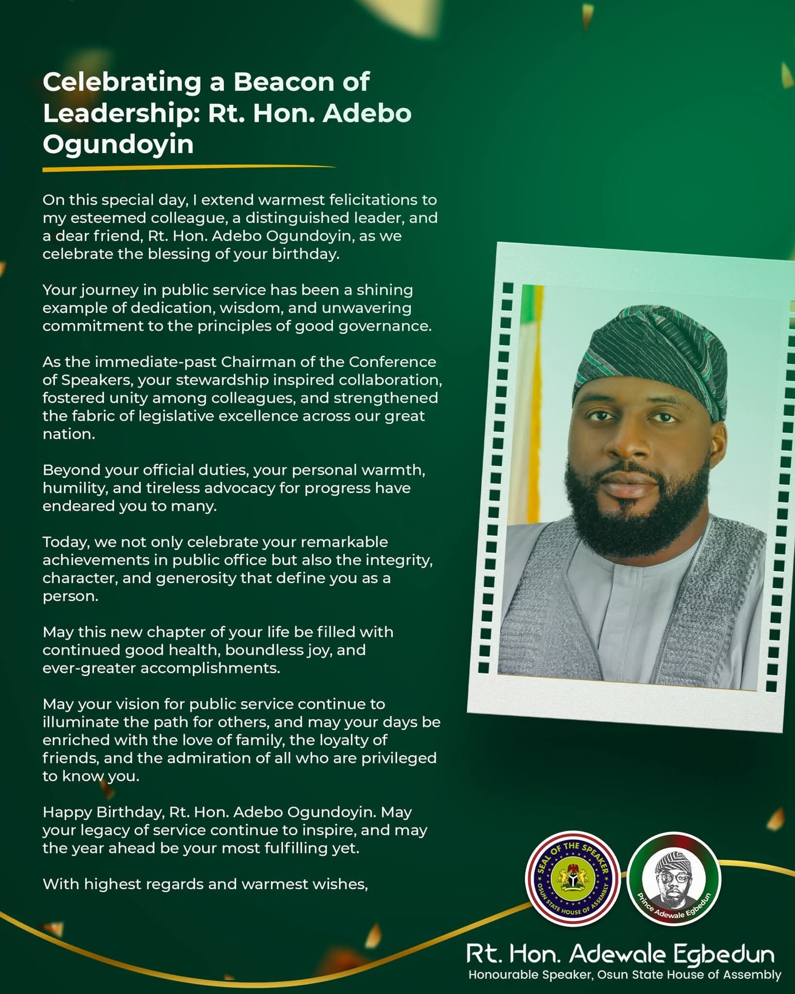 Osun Speaker Adewale Egbedun Celebrates Rt. Hon. Adebo Ogundoyin as ‘Beacon of Legislative Leadership’